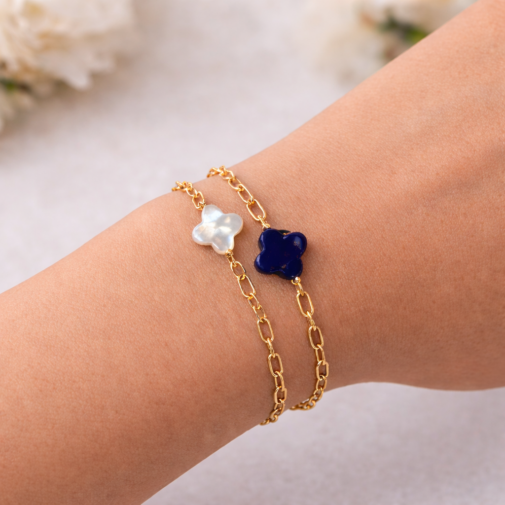 Gold Bead Bracelet with Mother of Pearl Clover